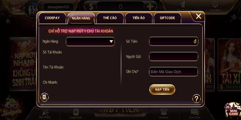 - Cổng game hỗ trợ nhiều phương thức gửi tiền như: Codepay, chuyển khoản nhanh qua ngân hàng, thẻ cào hay tiền ảo.